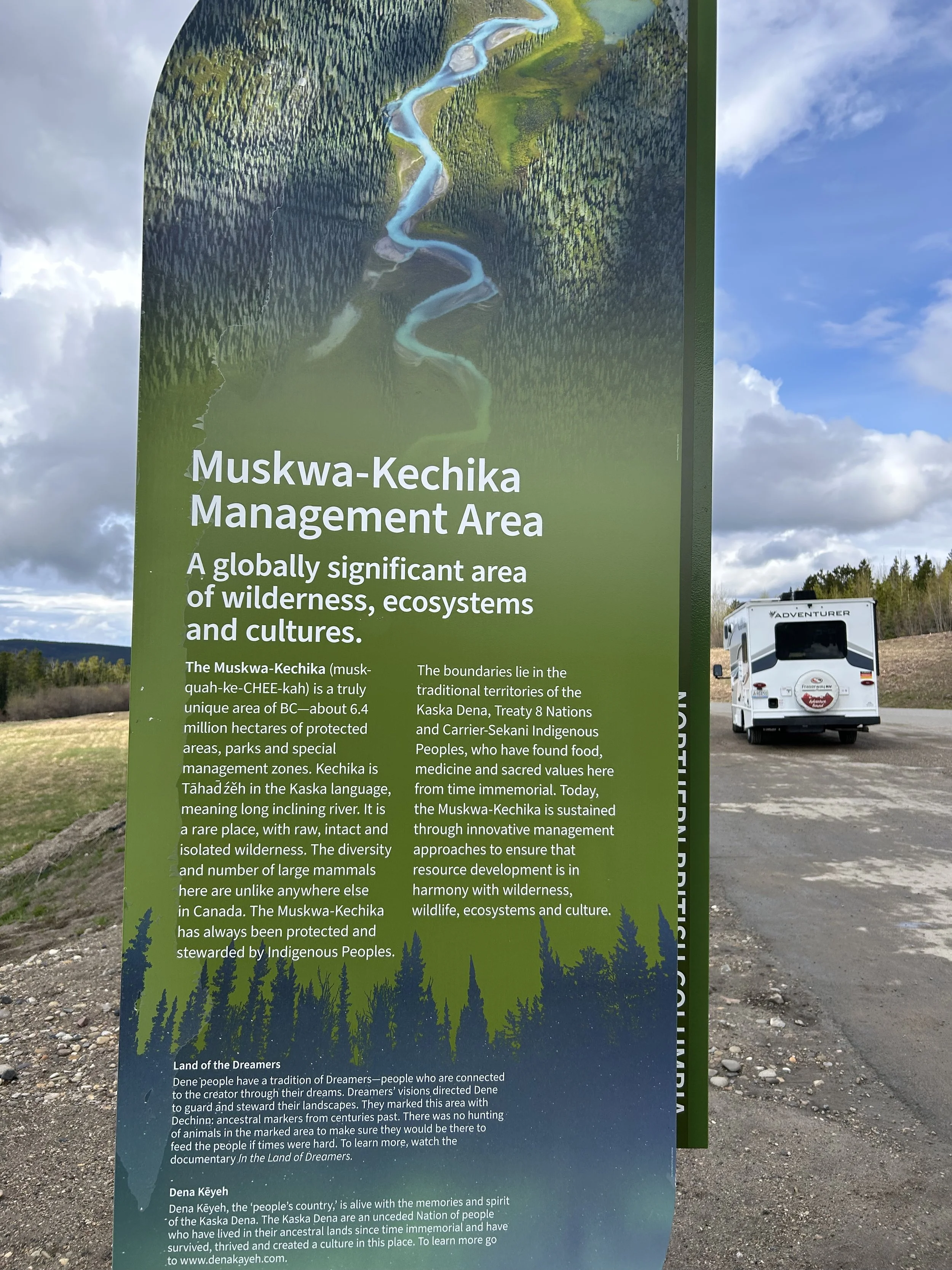 We dry camped at the hot springs in their “ overflow lot”. The camp sites were reportedly booked months ago because of the Victoria day long weekend. The drive to Watson Lake had lots of animals. Bear, woodlands buffalo, one caribou and mule deer. We saw lots of big horn sheep two days ago. Watson Lake has the famous sign post city. It’s an amazing collection of signs on lots of posts. They are primarily geographical signs from all over the world. Primarily from the United States. One was from Antrim county Michigan!